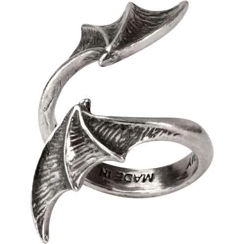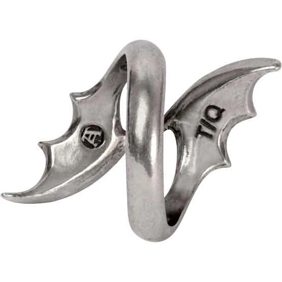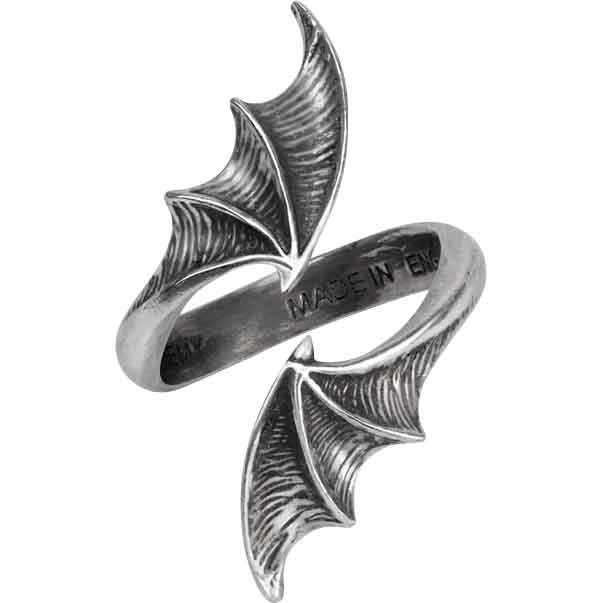 You can add some truly gothic style to your favorite outfit with the right accessory such as the A Night with Goethe Ring. Handcrafted from pewter, this gothic ring comes in three sizes. It has a twisted open-ended band with the ends facing different directions. The band ends with detailed bat wings. Each wing points away from the other. The A Night with Goethe Ring makes a great personal accessory or an addition to a gothic jewelry collection.