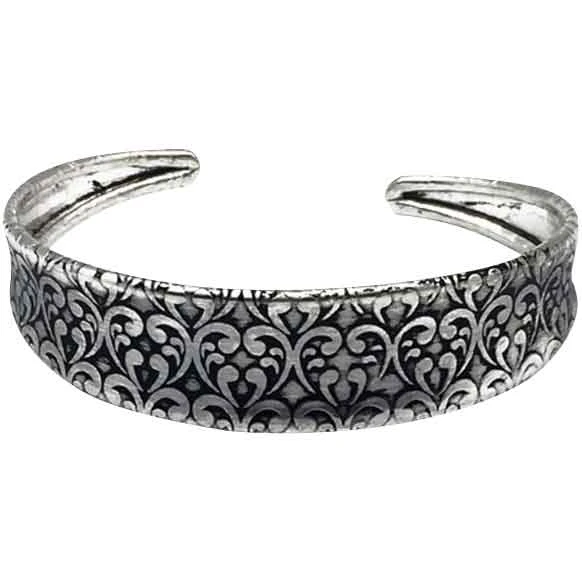 Show off unmatched elegance when you wear the Antique Silver Damask Cuff Bracelet. This medieval bracelet is brass plated with antiqued silver and has a curling damask pattern throughout its tapering, gently adjustable length. Darkened aspects in the damask pattern add depth to the design. Wear this antique silver bracelet as part of medieval, Renaissance, and fantasy outfits, or add its historically-inspired elegance to modern looks both casual and formal.