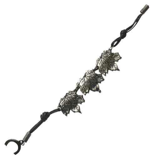 The beauty of this Antique Silver Maple Leaf Bracelet is something you just have to see for yourself. It is almost autumnal in its style, featuring a trio of charming, detailed leaves that you can wrap around your wrist as a unique personal accent. The bracelets little leaf charms are made entirely from fine pewter metal and are impressively detailed, being engraved to feature little veins and stems throughout its form. Three leaves are featured on the bracelet, and all three are featured with a dark yet polished antique silver finish. The three leaf charms are attached to black cotton cords on either side, which are also attached to closures to help secure the bracelet around your wrist. The natural, leafy style of this bracelet makes it a great addition to any woodland costume you might have, be it elf, princess, or fairy, while the great overall look makes this Antique Silver Maple Leaf Bracelet a killer accessory to wear with your more modern, contemporary looks, too!