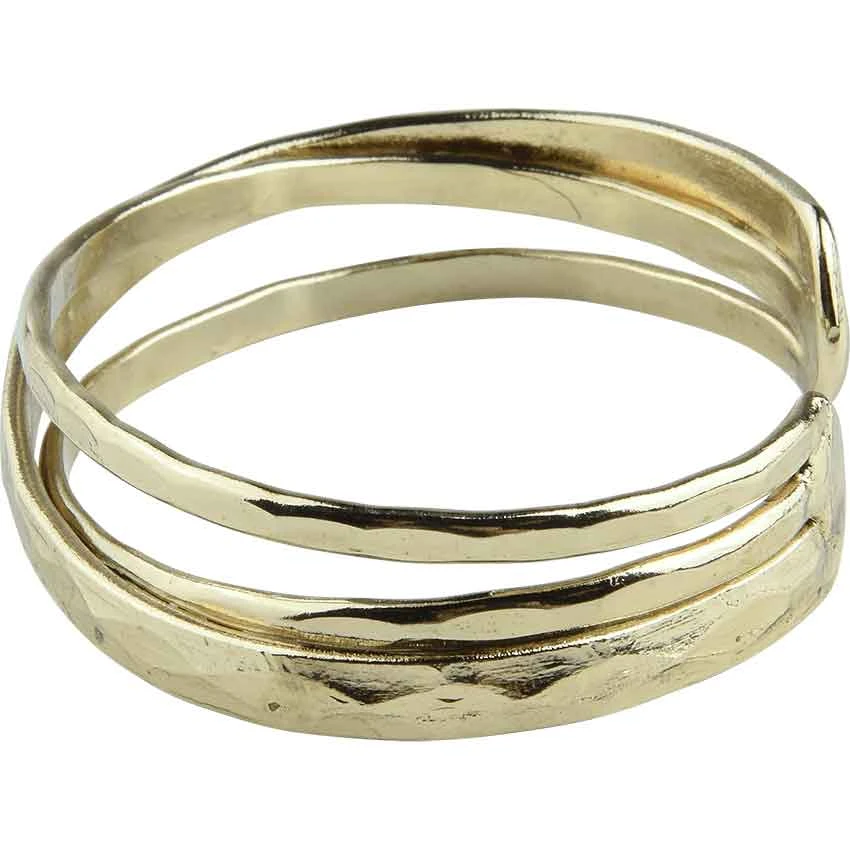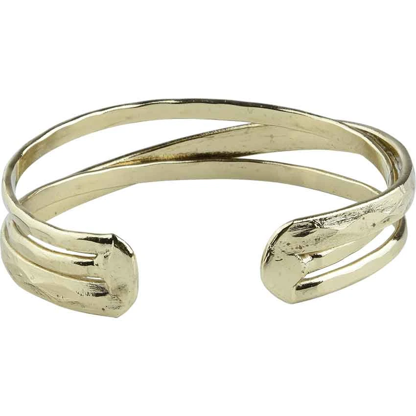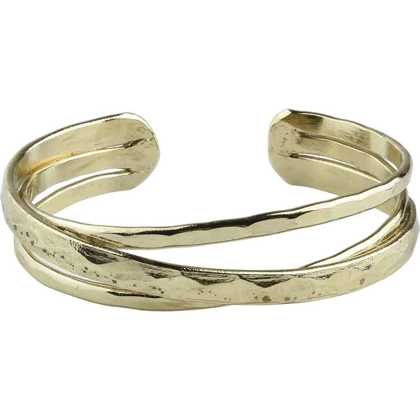 Nobles, warriors, and other important people throughout history wore jewelry. The Aodhan Medieval Cuff Bracelet looks great in a variety of historical styles. Made of brass, this cuff features a streamlined appearance. It has three bands; two bands form the top and bottom of the cuff. The third band angles from the top band to the bottom. All three bands end in a single, joining section on each side of the cuff. They also showcase a hammered finish. The open band design gives the bracelet some adjustability with the fit. This handmade bracelet also makes a wonderful accessory for many modern ensembles.