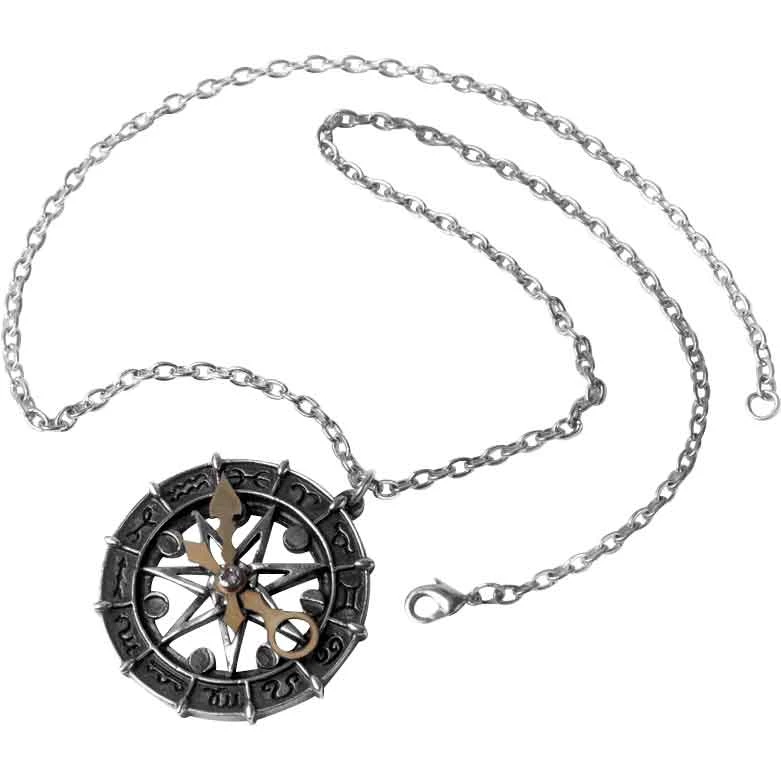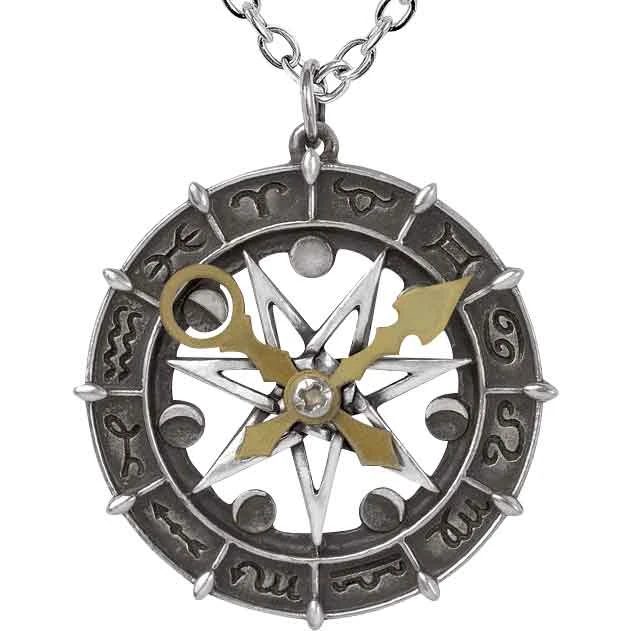 At the center of the star, there is a pair of brass-colored clock hands. One is a ring at the end, while the other forms an arrow at the tip. These hands are secured with a screw, allowing you to adjust the hands to point to a particular zodiac symbol and moon phase. This zodiac necklace makes a wonderful addition to any modern outfit or Wiccan jewelry collection.