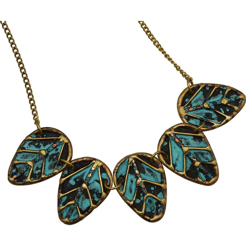 Before you head to the court or palace, make sure to accessorize properly. Add the Atlantis Leaf Fantasy Patina Necklace to your ensemble. Made from brass and copper, this necklace features five leaf shapes connected with links. At the ends of the leaf shapes, they also attach to a necklace chain. On each leaf, there is a copper main vein. It has a series of diamond shapes down its length. Then, there are brass V-shapes for the angled veins on the leaf. Meanwhile, the rest of the leaf has a greenish-blue patina. This necklace goes great with medieval and fantasy styles as well as modern jewelry collections.