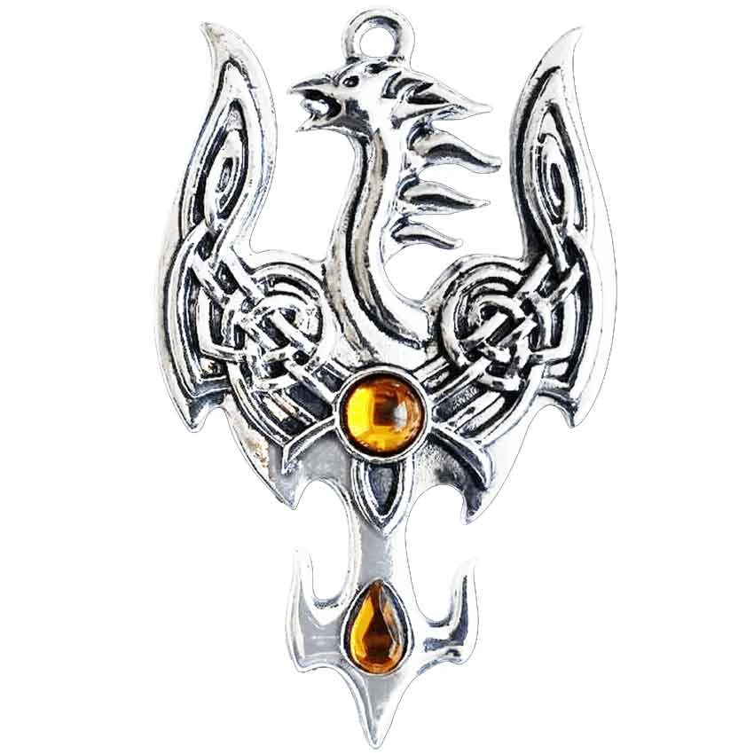 Inspired by the legend of Avalon, the mythical island where King Arthur is said to dwell as he heals and waits for the right moment to return, the Avalonian Phoenix Necklace represents transition and rebirth through its artistic design. In a beautiful silver tone, this Celtic pendant depicts a phoenix with its wings upward in flight, its neck feathers waving like flames pulled by the wind. Celtic knotwork decorates the majestic wings, adding an extra touch of artistry to this myth-inspired pendant. Two orange gemstones adorn the body of the bird, one rounded while the one below is teardrop shaped. Made of allergen-free zinc alloy, this Celtic pendant comes with a silver chain for wearing as a statement necklace. Timeless in both its beauty and symbolism, the Avalonian Phoenix Necklace is sure to suit many styles and tastes. Recall both Arthurian legend and tales of the mythic phoenix when you wear or gift this inspired Celtic jewelry piece.