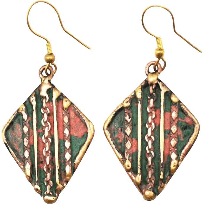 As you walk past the courtyard of the palace, you look like a noble wearing lovely accessories like the Avoie Medieval Patina Hook Earrings. Made from brass and copper, these earrings come as a set of two. They feature fishhook backings. Thus, they require pierced ears. Each earring is a diamond shape. There are five brass and copper lines that run vertically along each earring. The center copper line looks like a chain. The outer two copper lines have raised diamond shapes along them. Meanwhile, the rest of the earrings have a blue-green patina. These pieces of medieval jewelry work with a variety of styles and characters. You can also add the Avoie Medieval Patina Hook Earrings to your modern outfit.