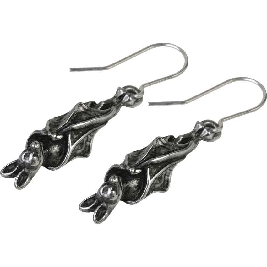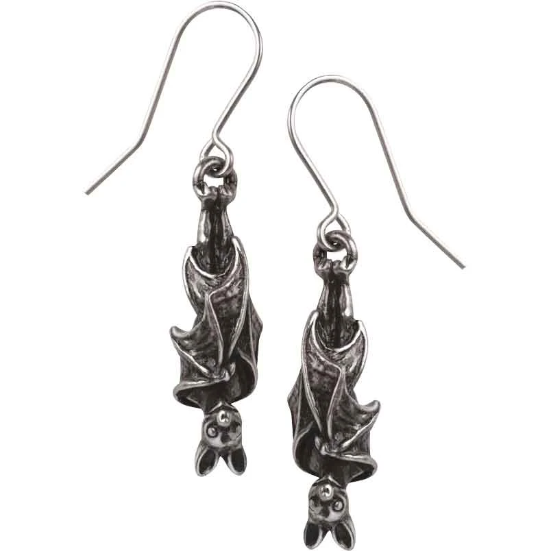 Roosting vampire bats hang silent and motionless deep within their cave, anticipating the subtle arrival of dusk as the last vestiges of light leave the sky. The Awaiting the Eventide Drop Earrings suspend a pair of upside-down bats with their wings wrapped tightly around their bodies. The resting bats eagerly wait for the sunset and the moment when they can sate their growing hunger. Crafted from high-quality pewter, the bats hang on surgical steel ear wires. The bats show off excellent detail with a darkened finish that goes great with almost any gothic ensemble.