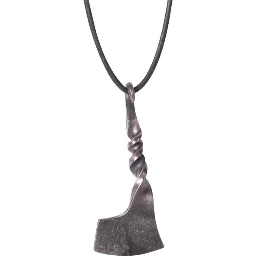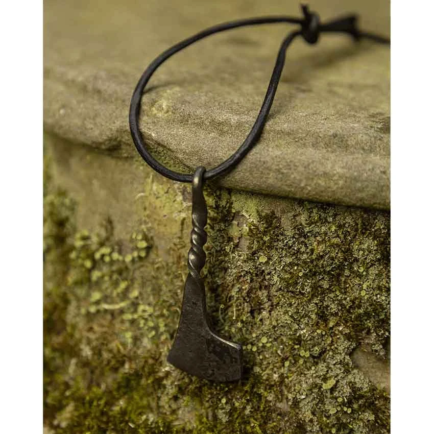 Why not add a unique piece of jewelry to your Norse or fantasy warrior ensemble? Make sure that you check out the design of the Axe Necklace. Made from wrought iron, this necklace comes on a black leather cord. It features an axe design and a forged appearance. The top of the necklace curls to form a loop for the cord. After the loop, the necklace twists three times. Finally, it forms a single-edged axe head. The Axe Necklace works equally well for medieval and Viking costumes as it does for modern outfits.