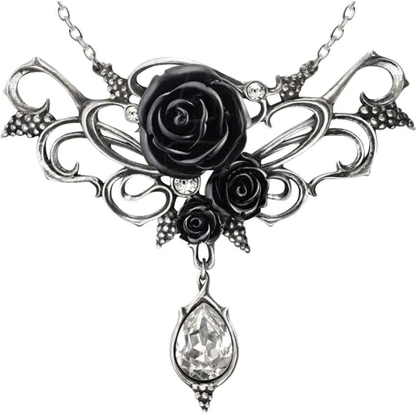 This sumptuous necklace hints at a secret libertine passion for wine and other pleasures with its romantic motif. The Bacchanal Rose Necklace displays several black acrylic roses of various sizes in the center of the design. Surrounding the roses, Swarovski crystals stud the twining grape vines. A glittering drop stone crystal hangs from the bottom center of the gothic necklace design. Anyone can enjoy the striking appearance of this crystal necklace with their favorite formal gothic ensembles.
