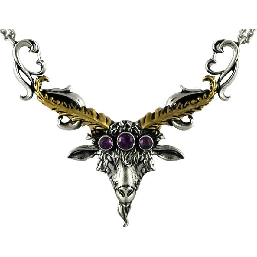 Bacchus was a god of wine and had associations with bearded satyrs. The Bacchanalia Goat Necklace pays homage to this god. Made from zinc alloy, this silver-plated necklace depicts a bearded goats head. The goats head faces forward. There are three purple gems on its forehead. On top of the goats head, there are gold-plated feathers that angle outwards like horns. Silver scrollwork sits behind the feathers. The included link chain attaches to the ends of the scrollwork. This necklace comes with a satin pouch and an info card. The Bacchanalia Goat Necklace makes a great addition to any Roman jewelry collection or nature-inspired wardrobe.