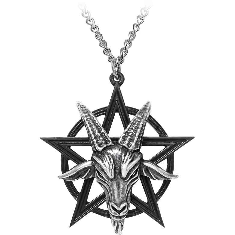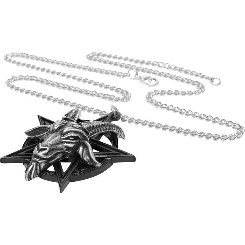 Based on the image by Eliphas Levi, the Baphomet Necklace features the appearance of an icon associated with pagans and demonic practices. Made from pewter, this necklace depicts a silver-colored goats head in front of a black pentacle. A pentacle consists of a five-pointed star with interwoven sides on top of a circle. The goats head is well detailed and faces down, revealing its horns. In addition, at the top of the star, there is a jump ring for sliding the pendant on its necklace chain. The chain fastens with a lobster clasp. You can wear this piece of Wiccan jewelry with the Baphomet Ring (AG-R239), sold separately. This necklace makes a wonderful personal accessory or an addition to a jewelry collection. It also works well as a gift.