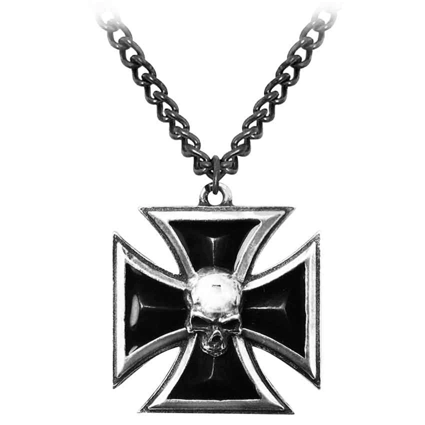 If a good knight is awarded a medal for his valorous acts, then what is an evil knight given for his dastardly deeds? Perhaps it is something like the Black Knights Cross Necklace in support of his nefariousness. This impressive skull amulet takes the shape of a classic iron cross, featuring broad arms that curve and gradually grow narrower towards the center. At the heart of the cross is a single skull, mounted like a sort of macabre decoration for a truly sinister soul. The arms of the cross are filled in with translucent black enamel, which adds a dark shine to this simply shaped pendant. The gothic necklace comes complete with an attached nickel-free chain, which makes wearing this accessory as easy as it is comfortable. Celebrate your darker side by awarding it with this Dark Knights Cross Necklace, and show the world that even a dark knight is something that can be respected and admired.