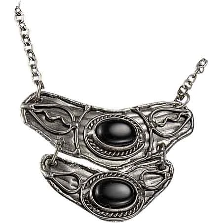 Plated in antique finished silver, the beauty of nature is made into something ethereal. Both layered panels of the Black Onyx Silver Tier Necklace feature artistic leaf filigree details alongside oval shaped, black onyx cabochons. The two layered panels have a gently curved shape, one suspended from the other while the top panel hangs from a matching silver tone necklace chain. An elegant addition to everyday, occasional, and fantasy-inspired fashions, this gemstone necklace artfully blends its ancient world inspiration with modern trend. Wear it yourself as a statement necklace, or gift it to a friend who will enjoy its unique, nature themed beauty.