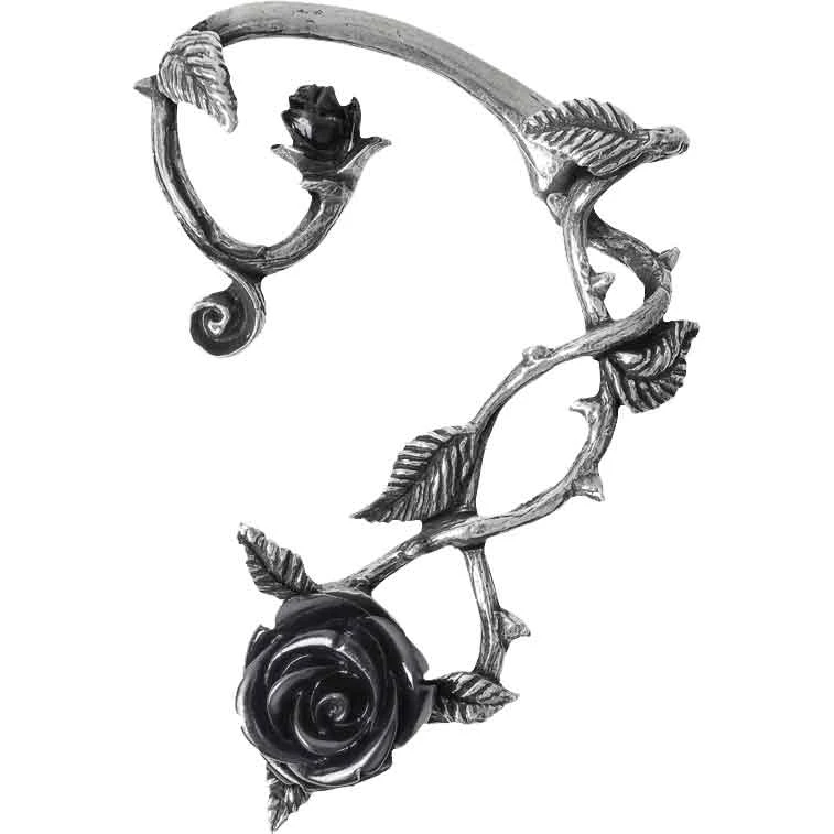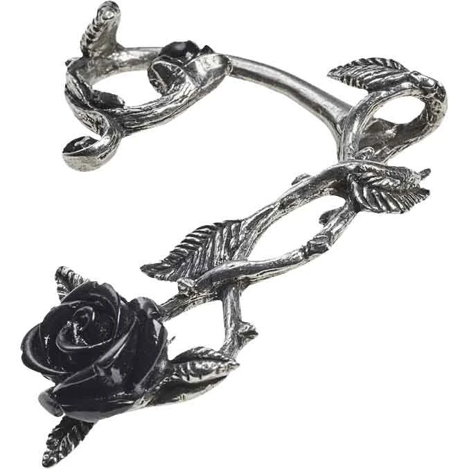 The rose serves as the perfect symbol of romance, its petals signifying the beauty of falling in love and its thorns representing the pain that comes with passion. The Black Rose Ear Wrap allows you to add this symbol to your ensemble. This pewter earring takes the shape of two rose stems twisting around each other, their thorns and leaves branching off elegantly. At the base of the earring is a large, blooming black resin rose, and at the top is a black rose bud. The ear wrap sits in the left earlobe via a surgical steel post, making it easy to wear and remove. The Black Rose Ear Wrap makes a fantastic piece of gothic jewelry that is sure to bring a hint of romance to your outfit.