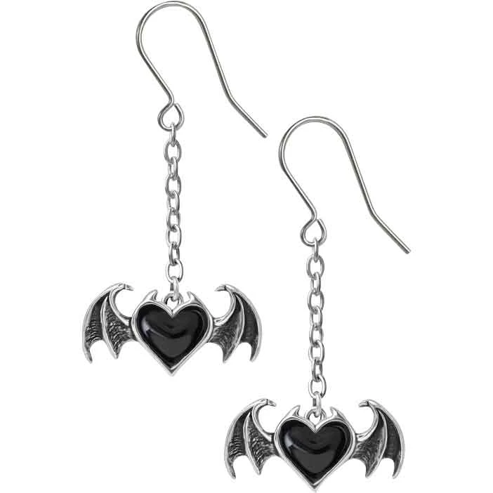 Add a touch of dark romantic style to your favorite ensemble by wearing the Black Soul Dropper Earrings. They have a great gothic style. Made from pewter, these gothic earrings come as a pair. They have fishhook backings, which require pierced ears. Hanging down from each fishhook backing is a short chain. The chain connects to the main design. Each earring features a black enamel heart. The pewter border forms two small horns at the top of the heart. In addition, there is a demonic bat wing on each side of the heart. Engraved detailing creates shadowing on the wings. These earrings make a wonderful personal accessory. You can easily add them to any gothic jewelry collection.