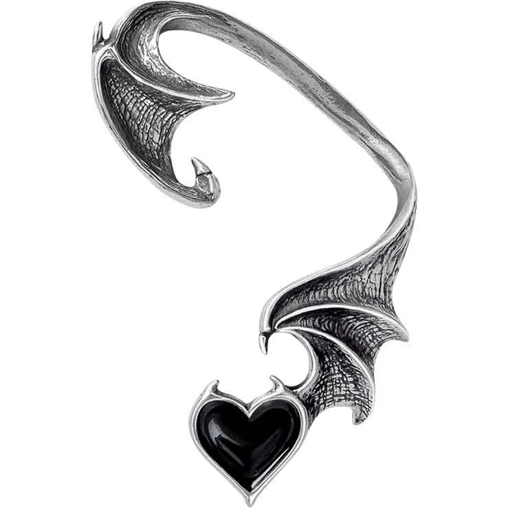 In addition, there is a demonic bat wing on the right side of the heart. The wing curls around to form the top portion of the ear wrap. This upper portion would curl around the back of the wearers ear. The bag wing has pointed claws. Engraved detailing creates shadowing on the ear wrap. You can easily add this ear wrap to any gothic outfit as well as any jewelry collection.