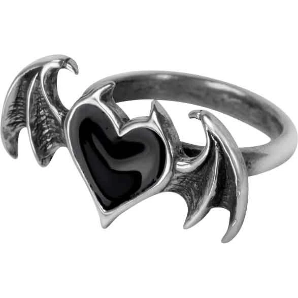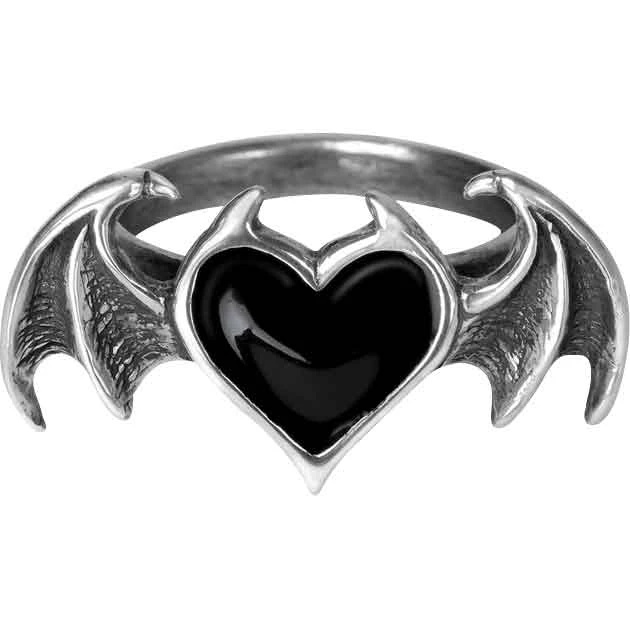 The Black Soul Ring is a great choice for anyone looking for a ring with dark romantic style. Make sure to check out this gothic ring. Made from fine English pewter, this ring comes in five sizes. It depicts a black enamel heart. The pewter border forms two small horns at the top of the heart. In addition, there is a demonic bat wing on each side of the black enamel heart. This piece of gothic jewelry matches the Black Soul Stud Earrings (AG-E444), sold separately. The Black Soul Ring makes a wonderful personal accessory or an addition to a gothic jewelry collection.
