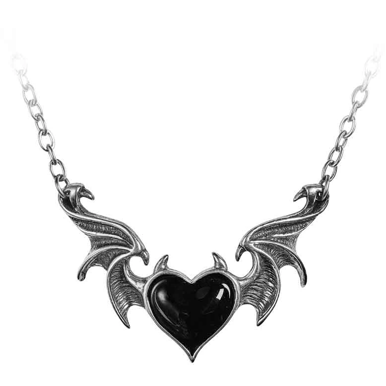 Whether you like the look of a black heart or you enjoy a demonic style, the Blacksoul Necklace is sure to match your unique sense of style. Made from pewter, this gothic necklace has a devilish appearance. It features a black heart with horns and demonic wings. The horns stick out of the top of the enamel heart. The wings spread out and upwards. At the ends of the intricately detailed wings, there are loops which connect to the necklaces chain. This necklace makes a great personal accessory and addition to any gothic outfit. You can also give the Blacksoul Necklace as a gift.