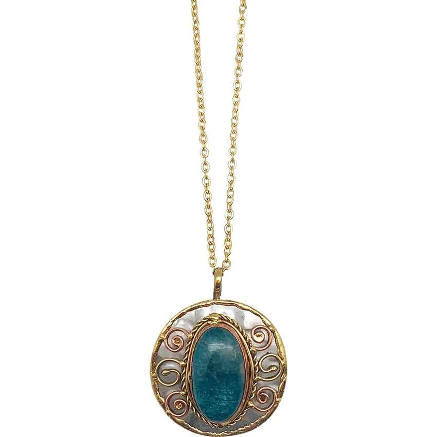 This handcrafted blue stone necklace has an artisanal look that is perfectly suited to historical settings. The stainless steel base of the necklace pendant is round. At its center is the oval-shaped apatite stone.