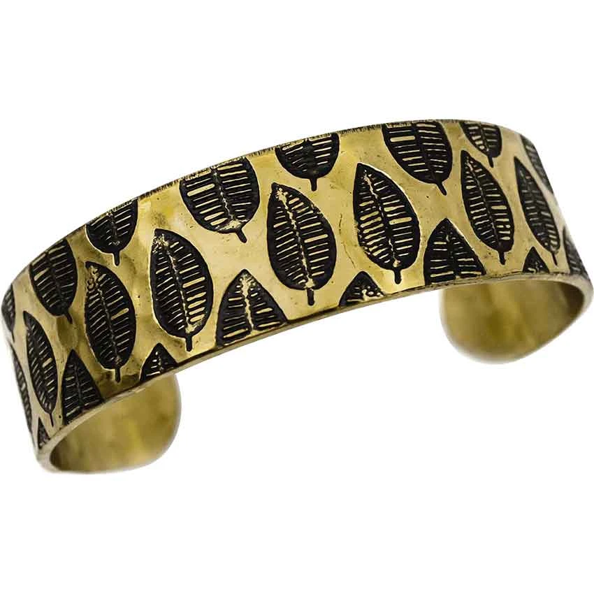 Bring the look of nature to your medieval or fantasy costume. The Brass Engraved Leaf Cuff Bracelet makes a great accessory piece. Handmade from brass, this fantasy bracelet comes in one size. It is slightly adjustable for a better fit. The bracelet has a cuff design, meaning that it looks like an open circle from the side. It has a medium-sized band with rounded ends. It has a hammered finish. Along the outside of the band, there are engraved leaves adorning the cuff. The detailed leaves are black, contrasting against the brass band. You can add this brass cuff bracelet to your everyday wardrobe or jewelry collection.