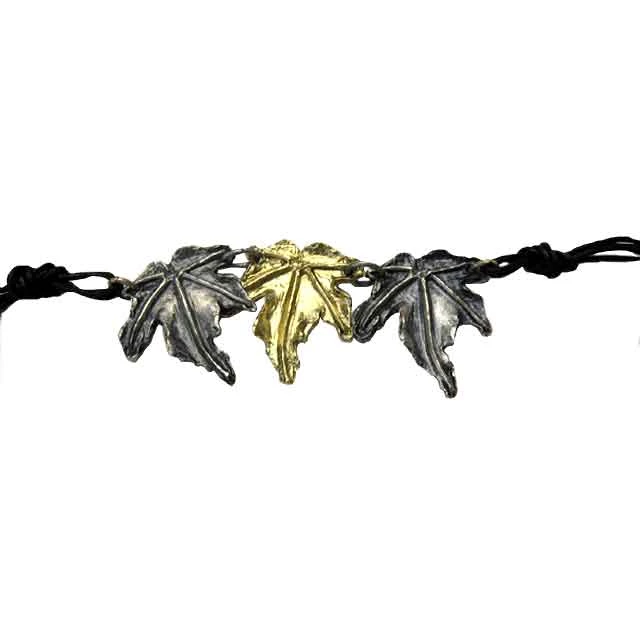 Embrace an influence of nature and take your look to a new level with the dazzling Brass Maple Bracelet. This extraordinary accent will have everyone admiring your bold fashion sense as you proudly wear this unique item. With pewter leaf charms finished in antiqued silver and polished brass, this bracelet stands out and demands to be seen. A combination of jagged edges and veins create a lifelike representation of a maple leaf. Three various charms all offer a unique plating that can complement any outfit in your closet. With a comfortable cotton band you can wear this nature inspired accessory anytime you want. Impress your friends and family with a stunning new accessory like the Brass Maple Bracelet, which will not disappoint you.