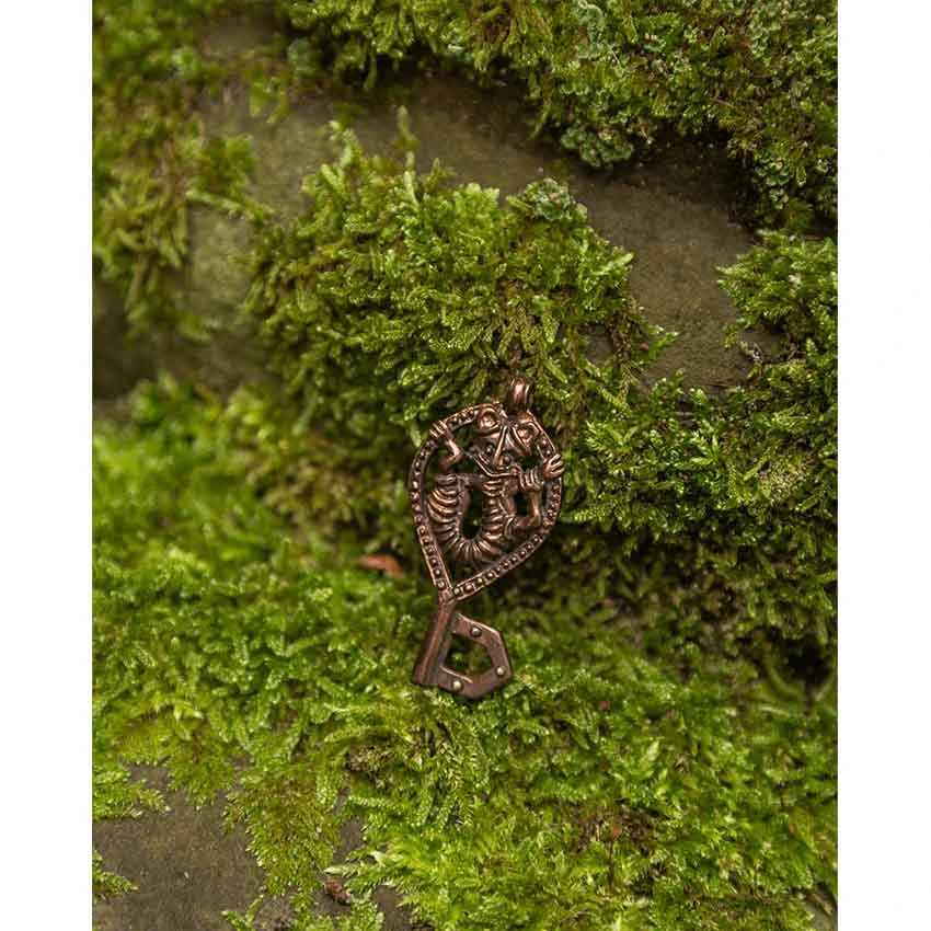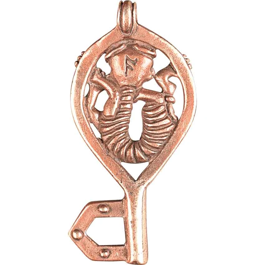 Do you want a necklace that attracts attention and finishes off your outfit? The Bronze Key Pendant is a wonderful option to choose. Made from bronze, this pendant has a loop at the top for sliding on a chain, not included. It features a key-like shape with a round handle. There are bumps along the edge of the keys handle. Inside the open key handle, there is a stylized creature with a striped body. It grabs onto the key with a couple of paws. The other end of the key features an open pointed design. Add this unique Viking pendant to your costume or ensemble. You can wear the Bronze Key Pendant to a LARP event, Ren faire, or cosplay convention.