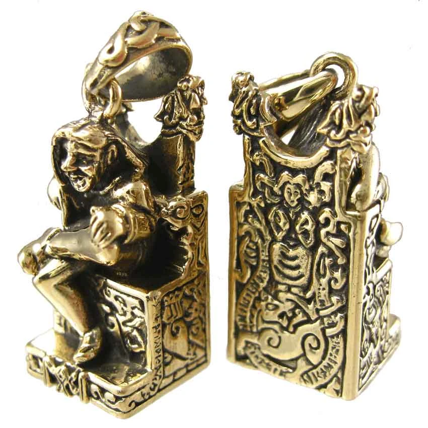 Each of the Norse gods has their own throne, and now, you can depict your favorite one seated on their throne, in the form of a personal accessory. This Bronze Seated Loki Pendant is for those who find favor with the mischievous god of tricks. This impressive little pendant features a rich, lustrous golden-yellow hue, thanks to it being crafted entirely in fine jewelers bronze metal. Loki is primarily known as a trickster god, although he also rules over fire. Generally seen as a villain, it is Lokis influence that causes the death of a god, and it is his breaking free that heralds Ragnarok. He is depicted in his pendant as crafty and jester-like god who sits on his throne, the back of which features his three monstrous children, the world serpent Jormungandr, the god-wolf Fenrir, and the half-decayed daughter Hel. This accessory is offered as a pendant only, and as such, can be worn with any cord or chain you own to make this into a rather impressive necklace. Even to this day, mythology remains a popular subject, and for those who love Norse mythology above all else, this Bronze Seated Loki Pendant is the perfect way to celebrate your love of this war-born pantheon.