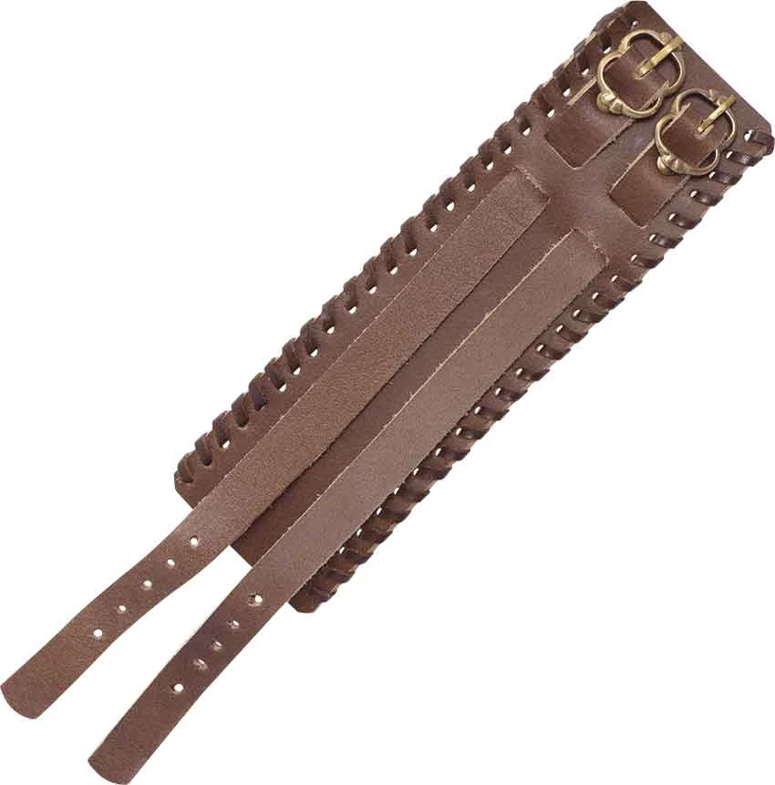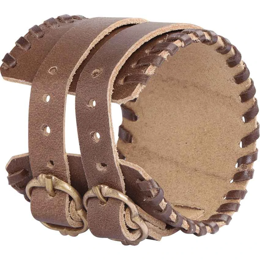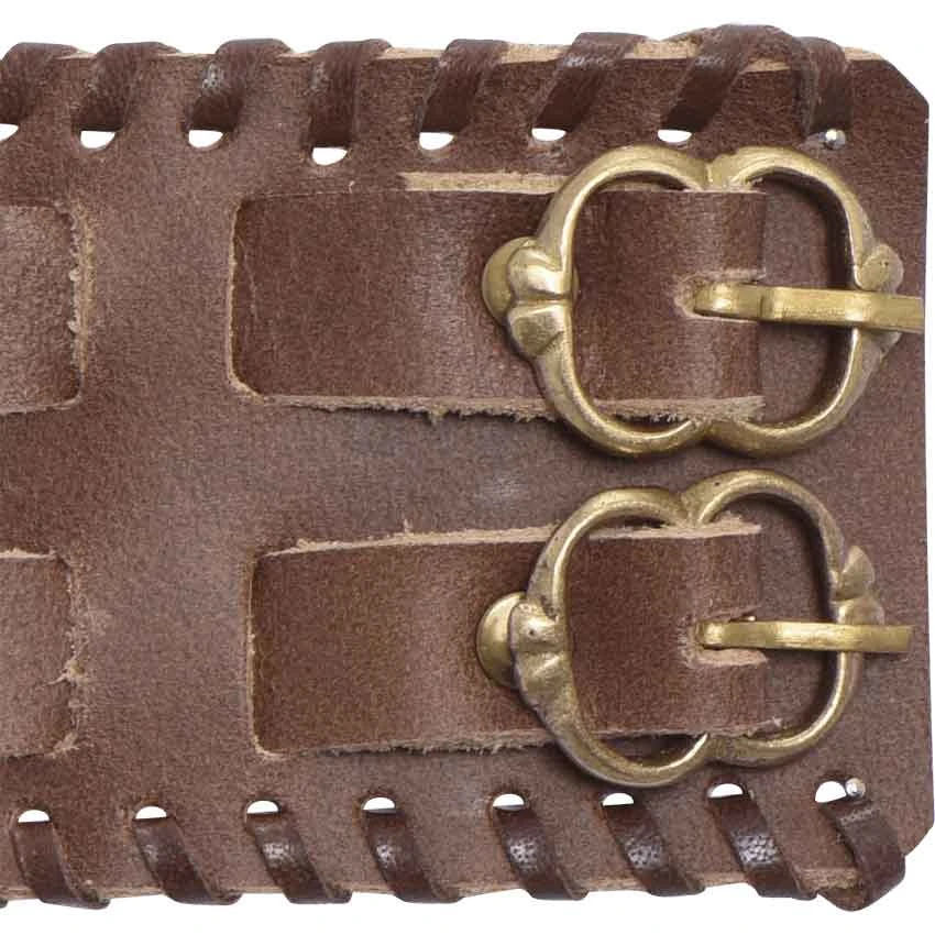 Many adventurers like to customize their style by choosing the proper items as finishing touches. The brown Buckled Leather Bracelet is a great choice. This brown wrist cuff consists of a broad leather band to which two smaller leather belts have been attached. Each of the smaller bands has a buckle on one end and five holes on the other. These holes allow the wearer to adjust the fit to their comfort. Leather lacing adorns the edges of the bracelet. Its versatile design works with a variety of outfits, such as medieval costumes. The brown Buckled Leather Bracelet makes a great personal accent.