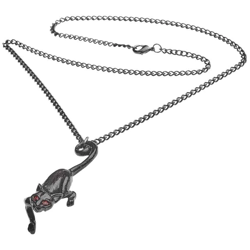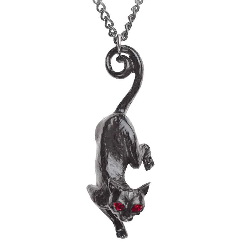 A common fairy creature in Celtic lore, the Cat Sith takes the form of a black cat that can be as large as a dog. The Cat Sith Necklace draws upon this folklore to take the shape of a crouched black cat with deep, ruby-red eyes. Made from blackened English pewter, this feline pendant is seen in a stalking position, crouched low to whatever surface it rests on. The eyes of the Cat Sith are set with red Swarovski crystals. The tail of the pendant acts as a loop through which a ring is linked, allowing it to hang on its black trace chain. This beautiful piece of Celtic jewelry is perfect for cat lovers, folklore enthusiasts, and fans of Wiccan or Celtic fashion!