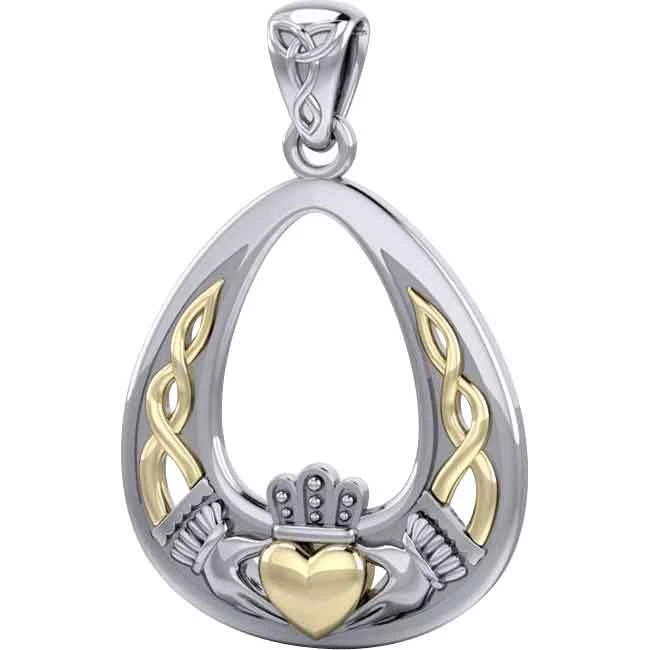 When you are looking for a romantic pendant to wear or to give as a gift, the Celtic Claddagh Silver and Gold Pendant is a great option. Made from sterling silver, this pendant has a flat, teardrop shape. At the bottom of the pendant, it depicts the famous claddagh symbol. The hands and the crown are silver while the heart is 14k gold. On each side of the claddagh is twisting knotwork. The golden knotwork has cutout spaces between the lines. At the top of the pendant, it has a bale for attaching a chain, not included. It features a silver trinity knot with an extra twist. This silver and gold pendant makes a lovely personal accessory, adding Celtic style to any outfit.