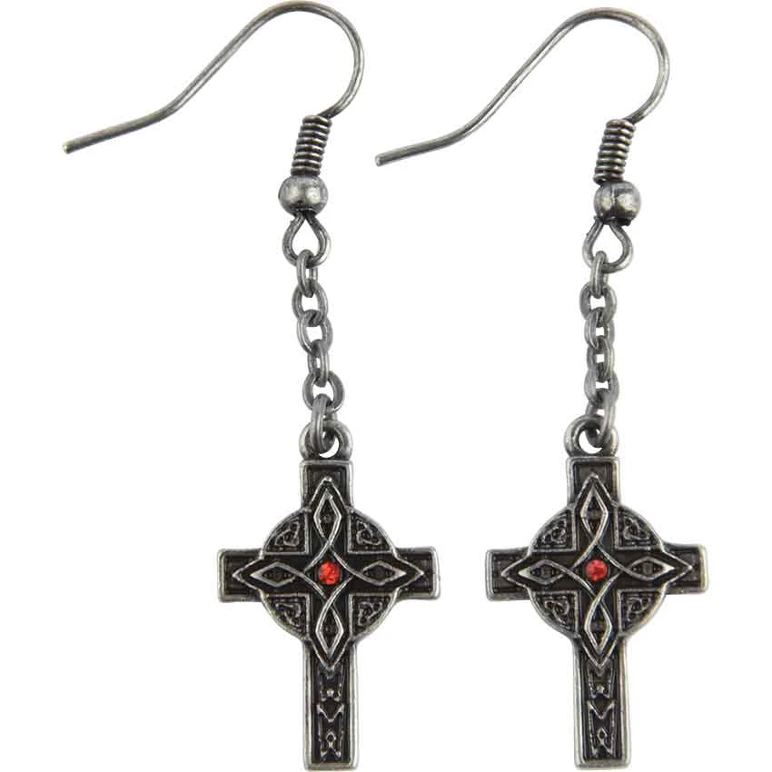 The Celtic cross combines the cross with a nimbus that surrounds the point of intersection, often with other decorations. The Celtic Cross Dangle Earrings offer this construct with designs over the face of each cross. The center of each intersection includes a round, bright red accent crystal that offers them an eye-catching burst of color. Each earring features blacking that gives them an antiqued appearance and additional character. Crafted from lead-free pewter, these earrings make fine accessories for formal wear or casual attire.