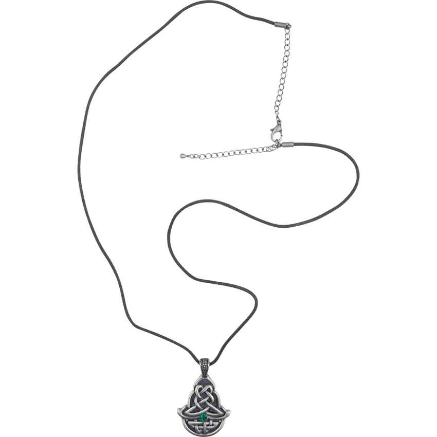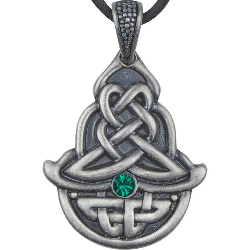 Hit the town and be prepared to impress the world with the stylish and daring Celtic Emerald Necklace. This original jewelry piece can be the fashion accessory that separates you from everyone else in the room, so grab one today. This item was crafted from lead free pewter and then carefully polished to obtain a unique finish. This piece is formed by a collection of Celtic knots. Complex overlapping lines help create a stunning design. There is a lovely green accent gem that is placed in the center to command attention to this powerful accent. Step up your fashion game today and welcome the Celtic Emerald Necklace into your personal jewelry collection.
