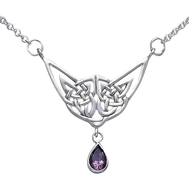 Symbolizing interconnectedness and eternity, Celtic endless knots have been a part of Celtic art for ages. The Celtic Eternity Knot Teardrop Gem Necklace displays a symmetrical knot design with a shimmering drop stone. The delicate chain connects to each side of the knotwork, and the gem hangs from the center of the design. Made from white bronze, the Celtic necklace is plated with sterling silver for a gleaming appearance. The synthetic gemstone accent is available in amethyst glass, black onyx, garnet glass, or white quartz. Please note that certain gem options may come with a price adjustment.