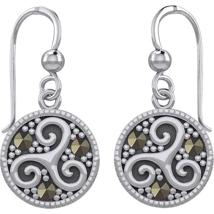 Make sure to check out the Celtic Spiral Triskele Silver Earrings if you are looking for a way to finish off your Celtic-themed ensemble. Made from .925 sterling silver, these earrings come as a pair. They have fishhook backings. Therefore, they require pierced ears. The earrings hang from loops attached to the hooks. Each earring has a circular shape. A lined border runs along the edges. In the center of each earring is a spiral triskele. There is a round marcasite stone between each spiral. Small silver dots fill in most of the remaining space. You can add these earrings to a variety of outfits, including ones for special occasions.