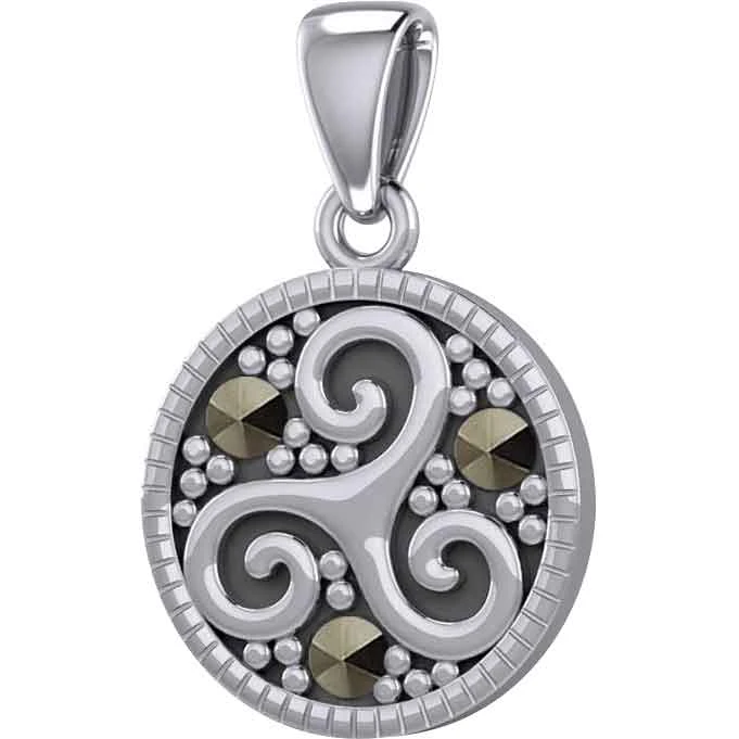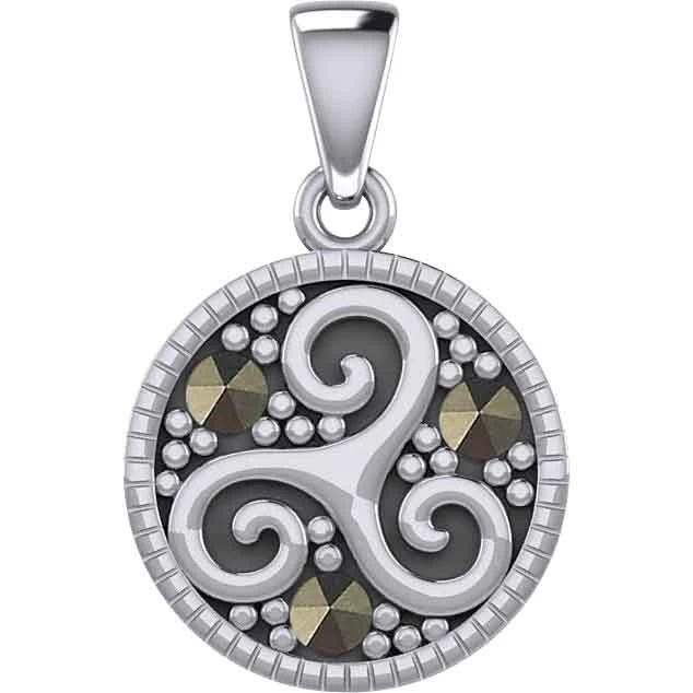 If you are looking for a way to finish off your favorite Celtic-themed outfit, why not check out the Celtic Spiral Triskele Silver Pendant? Made from .925 sterling silver, this pendant has a circular shape. A lined border runs along the edges. In the center, there is a spiral triskele. A round marcasite stone adorns the pendant between each spiral. Small silver dots fill in the rest of the space. At the top of pendant, there is a triangular bale. The bale allows the pendant to slide onto a chain, not included. You can add this pendant to a variety of ensembles, including ones for special occasions. It wonderfully matches the Celtic Spiral Triskele Silver Earrings (PS-TER1827), sold separately.