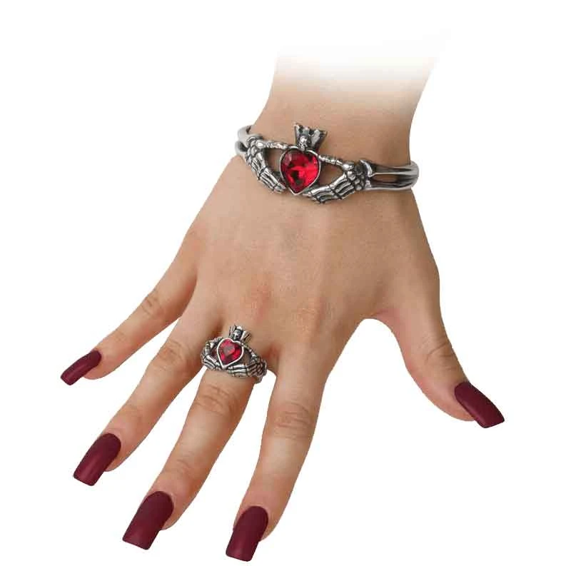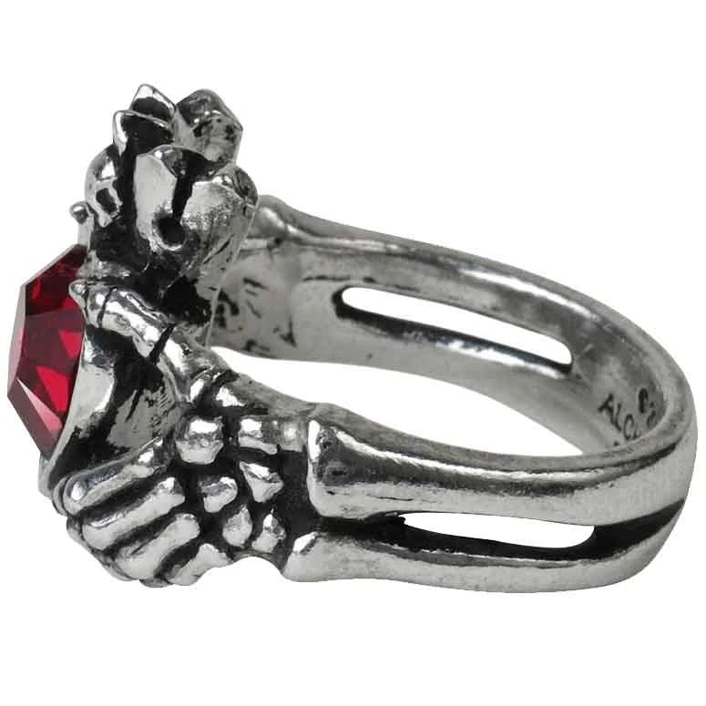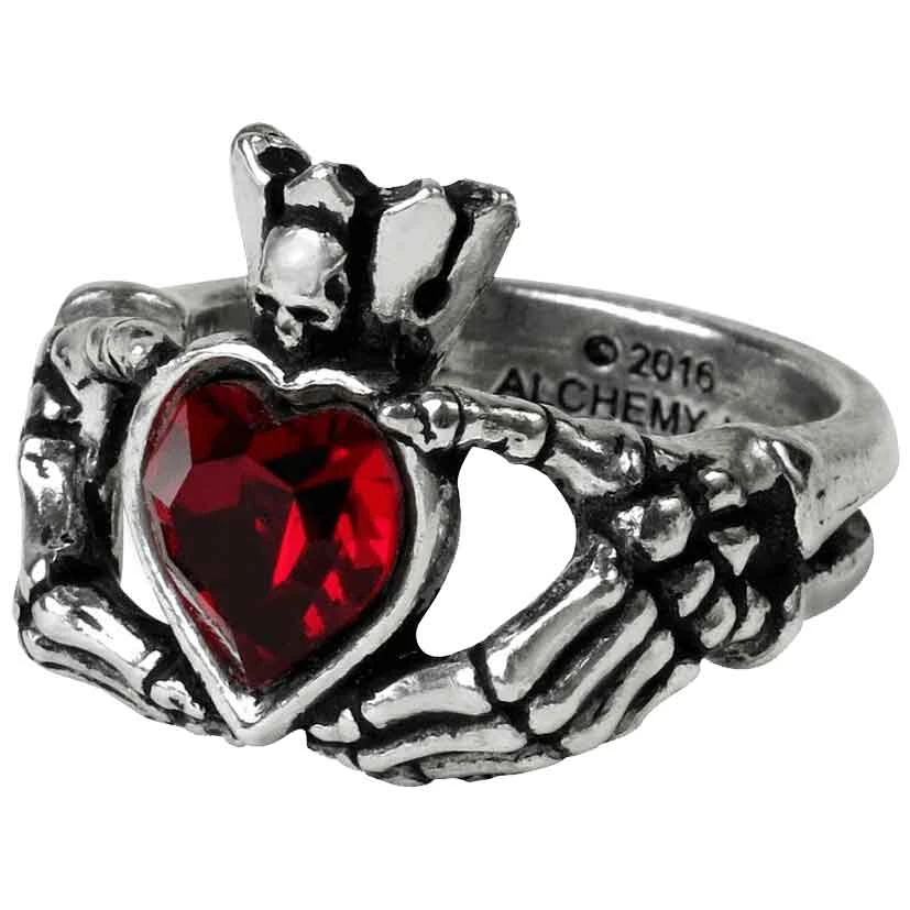 Symbols of love, friendship, and loyalty were combined into the Irish Claddagh, a design that has endured since the 17th century. Now updated with a Gothic twist, the Claddagh By Night Ring shows that love transcends physical death. Handcrafted from fine English pewter, the polished ring portrays a Gothic version of the Irish Claddagh. Two skeletal arms with bony hands encircle the finger to hold a red Swarovski crystal heart. The crystal heart is surmounted by a crown featuring a tiny skull. The Claddagh By Night Ring is an elegant choice for formal or casual events.