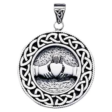 The Irish Claddagh is an ancient symbol representing friendship with outstretched hands, love with a heart, and loyalty with a crown. This silver pendant also features an intricate Celtic knotwork border. It makes an elegant gift for yourself or someone special. The Celtic Knotwork Collection has been created to celebrate Celtic heritage and capture the intricate knotwork designs that have inspired mankind for ages. Meticulously crafted from fine sterling silver, the Claddagh with Celtic Knotwork Pendant showcases the beauty of Celtic tradition. A necklace chain is not included, but is available for purchase separately.