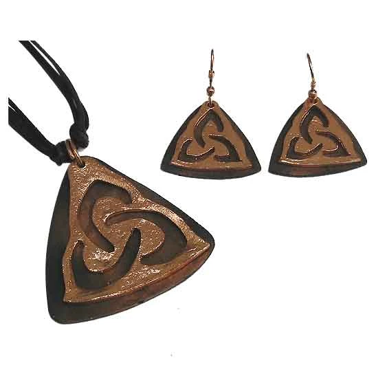 Welcome the ancient and fashionable design of the original Copper Triquetra Jewelry Set into your wardrobe today. This stunning collection will become a game changer for your look and make you a true fashion guru among your peers. Each piece of this impressive set was carefully hand crafted from quality pewter and has two distinct but complementary finishes. The triangular background piece has an antiqued finish to produce a rustic and ancient tone. The main polished copper cover has a dazzling Celtic triquetra symbol etched out of it. The pendant is casually draped on a comfortable cotton cord. While the set of hook style earrings can be worn with any outfit. Dress to impress with the help of the Copper Triquetra Jewelry Set and you will receive many compliments on your daring sense of style.