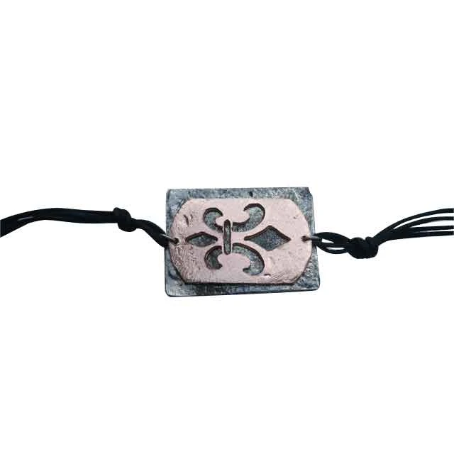 A symbol of royalty, the fleur de lis remains an iconic design of the medieval and Renaissance eras. The Copper with Silver Fleur de Lis Bracelet displays a striking artisan jewelry appearance created with several fine metals. The fleur de lis design appears as a cutout on a tag that overlaps a metal rectangle. The handcrafted bracelet is made from pewter with antique silver and copper coatings to create eye-catching contrast. The ornament attaches to cord at each end, fastening with a toggle clasp for easy wearing. Whenever you want unique jewelry to accent your favorite outfit, make sure to check out this fantastic fleur de lis bracelet!