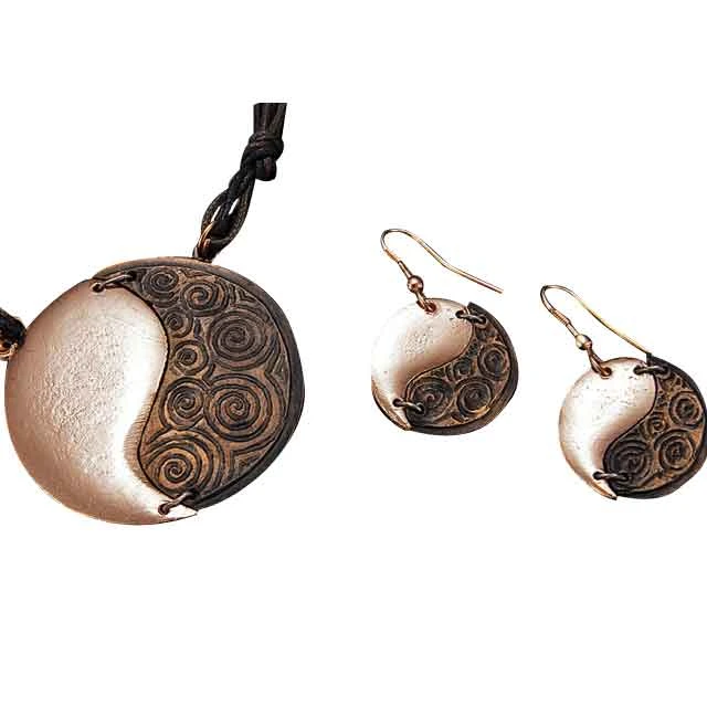 Bring a bit of balance and elegance to your jewelry collection with the stunning Copper Yin Yang Jewelry Set. Embrace Chinese influences and welcome the fashionable harmony that this collection can bring into your collection. Hand crafted from pewter and finished in two tone copper this beautiful and original jewelry set would be a great compliment for nearly for any occasion. Each piece is hand assembled and formed into a water drop shape that can fit perfectly into one another. The antiqued copper has a spiral design to enhance the vibrant polished copper tone of the other half. With each set the necklace is hung on a modest cord while the earrings are hook style to create a convenient and dazzling pairing. Pick up a perfect handmade accent like the Copper Yin Yang Jewelry Set, which would easily enhance any outfit.