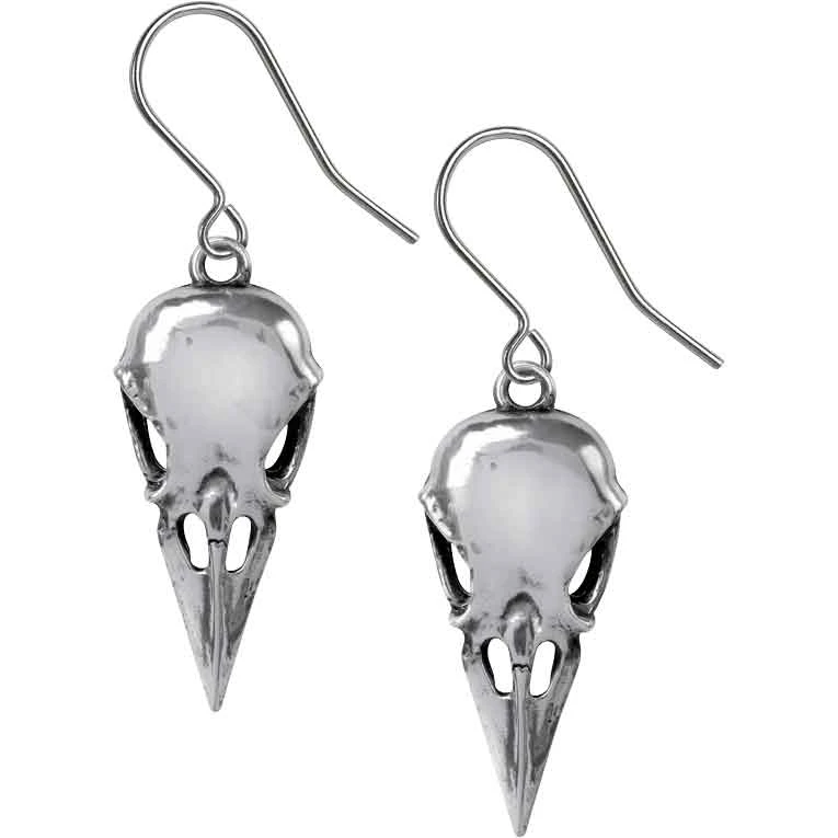 You can easily add a touch of the macabre and some avian style to your look by wearing the Corvus Coeur Earrings with any outfit. Made from fine pewter, this pair of gothic earrings has surgical steel fishhook backings. Therefore, they require pierced ears. Each earring takes the shape of a raven skull. It has cutouts for the eye and nose sockets. The well detailed skulls have an antiqued finish. These raven skull earrings are great for everyday wear. The Corvus Coeur Earrings work well with any gothic jewelry collection.