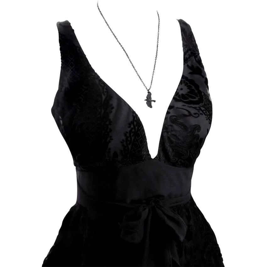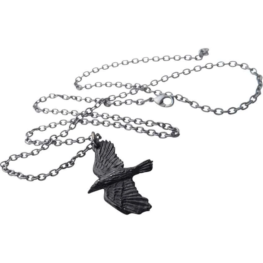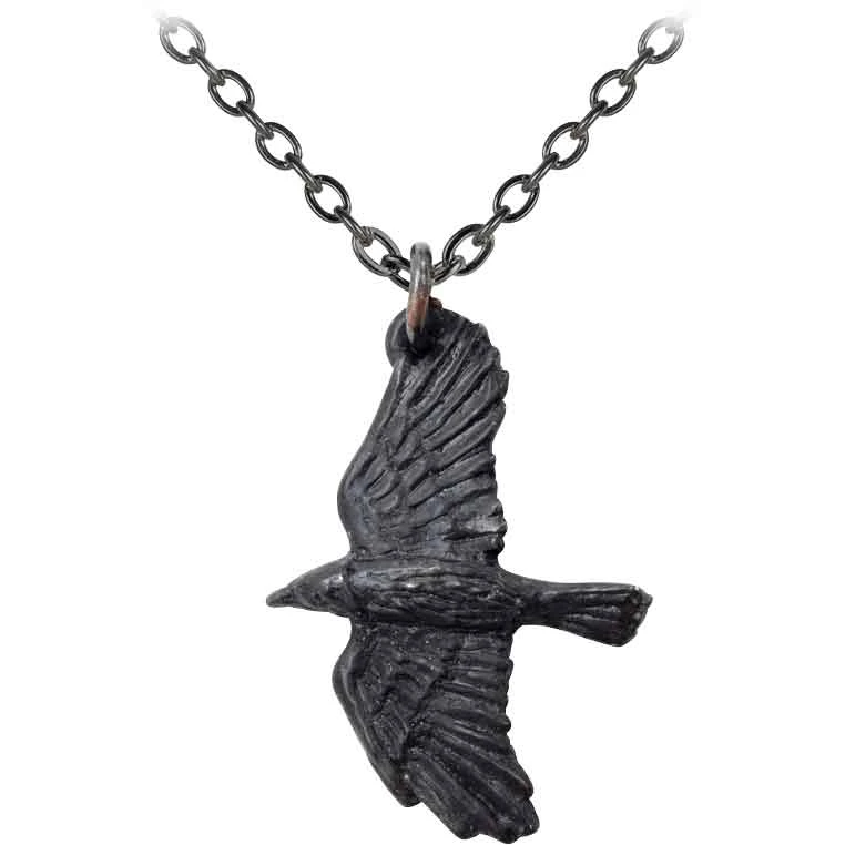The raven has been a symbol of protection, information, and dark secrets from early times in history, appearing in Christian, Celtic, and Norse stories. The Corvus Corax Necklace depicts one of these clever birds in mid-flight. The gothic pendant shows excellent detail in the form of the raven, depicting its rows of feathers and sleek body. Crafted from the finest English pewter, this blackened pewter necklace makes a charming addition to the attire of tricksters and bird lovers. Fans of gothic attire will appreciate the appearance of this raven necklace, as well.