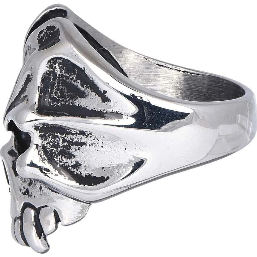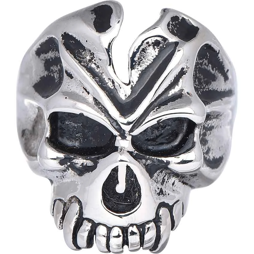 For those who admire the dark and sinister aura of the undead, the Cracked Vampire Skull Ring lends a touch of grimness and power to gothic, biker, and rocker looks alike. This statement ring reveals the true darkness of your soul. Cast from stainless steel, this jewelry piece takes the shape of a partial vampire skull. A pair of fangs extends from the upper jaw. Cracks mar its forehead and temple, while black enamel detail defines every feature. The Cracked Vampire Skull Ring lends a fierce edge and raw power to any look, a stylish accompaniment to those who define their own style.