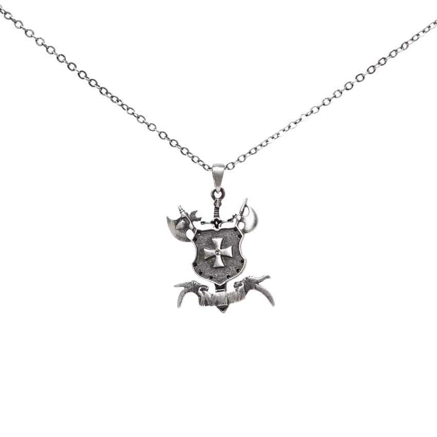This heavy metal pendant takes the symbols of a Crusader and transforms them into a wicked representation of medieval style. This Crusaders Cross Necklace is designed well enough that it can be worn with any outfit you own! This impressive necklace consists primarily of a wicked pendant that is made up of several medieval weapons, including a traditional long sword and two styles of battle axes, all crossed behind a Crusaders shield. Underneath the shield is a depiction of an unfurled pennant or scroll. The Crusaders shield is adorned with a small white rhinestone at the center of its cross along with small black adornments along the edges. The pendant is made from lead free metal, and it comes with an attached silver chain for easy and convenient wearing. The Crusaders Cross Necklace is not just a fantastic piece of costume jewelry, but it is also a great medieval accessory to wear with any of your modern outfits when you want to infuse just a touch of your medieval soul into your every day.