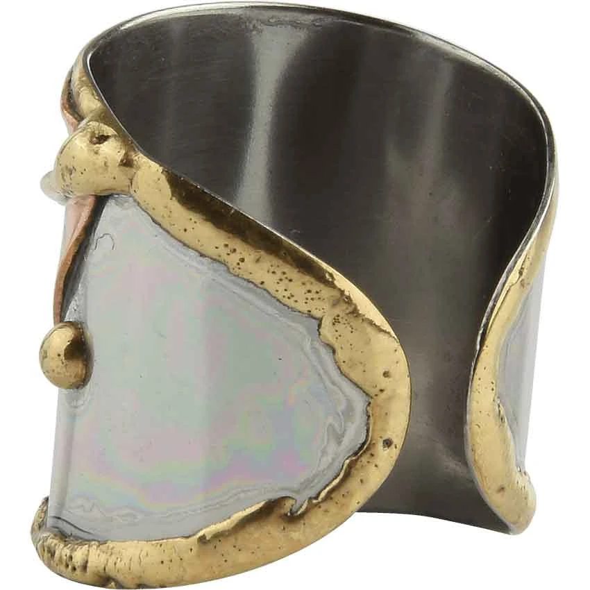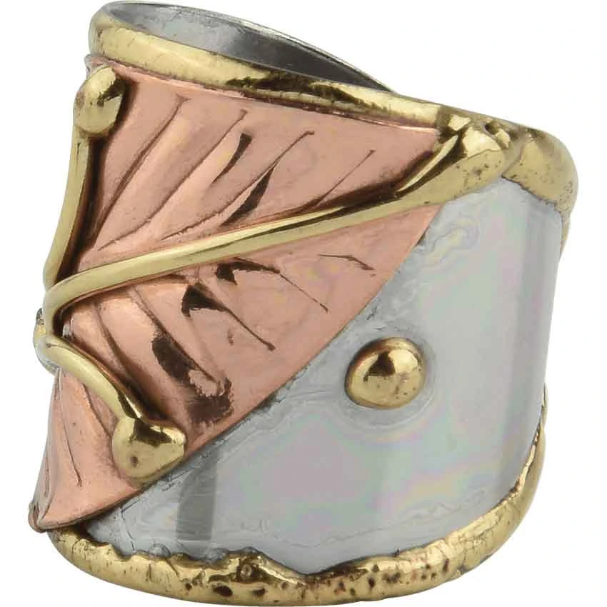 Any ladies who claim autumn as their favorite season will appreciate the nature-inspired design of this artisan ring. The Curling Leaf Cuff Ring displays the artistic depiction of a fallen leaf across its wide band. Handcrafted with a stainless steel base, this mixed-metal ring features a large copper leaf with brass details and edging. Lines mark the veins of the leaf, adding a touch of realism. This adjustable cuff ring will fit comfortably on most fingers, making it a great choice for year round wear. As a fashion accessory, this metal ring makes a fantastic pick for formalwear or casual ensembles!