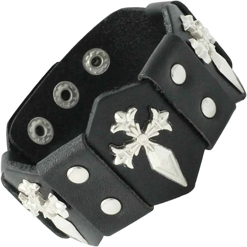 Crosses and daggers are very large components to the gothic fashion, so a dagger cross is twice as gothic as either of the other two, right? The Dagger Cross Wristband looks like the epitome of gothic apparel with all its crosses. This handsome black wristband is made from black leather and has been decorated with stainless-steel cross-shaped dagger rivets. Between each of the rivets, which bear a fleur de lis style appearance, is riveted a small band of leather. Three snap buttons are fixed to the band of this bracelet, allowing you to decide how tightly the bracelet clings to your arm. Accent your outfit with this handsome gothic bracelet, or give it to a friend or loved one as a special gift!