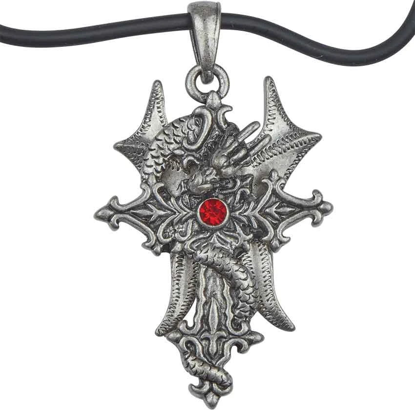 The Dragon with Gothic Cross Pendant can be a great way to add some gothic fantasy into your current wardrobe. This subtle accent combines several genres to produce a bold and dazzling jewelry item, so do not pass up a chance to own one. With a full lead free pewter construction, this item is filled with engraved details. The stunning gothic cross has crimped points and a vibrant red accent gem. There are several symbols crafted into the body of the cross that enhance the religious tone of this piece. The dragon has individual scales and wings that are folded in just behind the cross. Show your love and appreciation for both these worlds with the magnificent and fashionable Dragon with Gothic Cross Pendant.