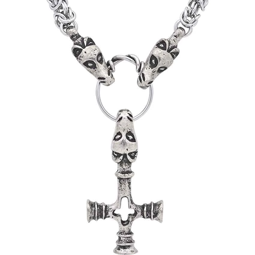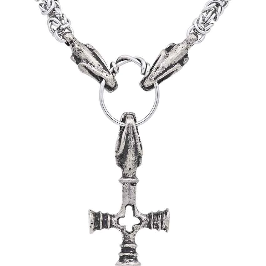 The original dates to the 11th century, when the Vikings were converting to Christianity but held on to their old gods. Thus, jewelry and other pieces could and would combine symbols from the two religions.This pewter necklace showcases that historical combination.