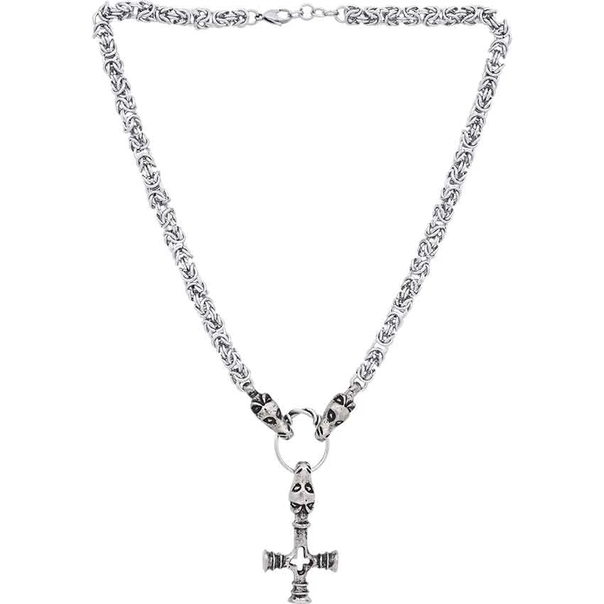 It combines a version of Thors hammer with a cross at the bottom. The ends of the cross have ridges that get bigger towards the tips. In the center of the cross, there is a cross cutout. At the top of the antiqued cross, there is a dragon head, a creature common in Norse mythology. The dragon head bites onto a a stainless steel ring.