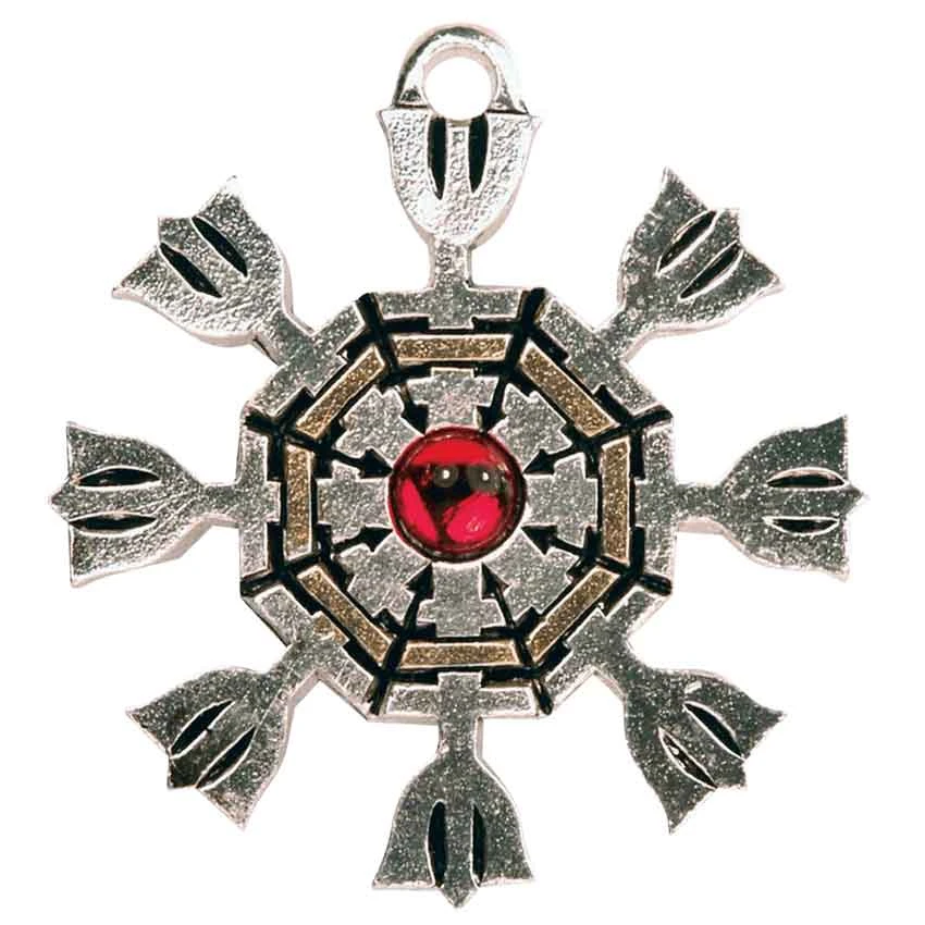 Known also as the helm of awe or Aegishjalmir, this Eagershelm Viking Necklace is considered an arrangement of magic staves, which in old myth was said to induce fear and awe, as well as helping to protect the wearer from an abuse of power. The pendant consists of a shield-like central emblem from which several staves extend out of. Concentric rings of silver and one of gold adorn the center of the talisman, along with a vibrant red Swarovski crystal cabochon. Included with the pendant is a chain necklace for easy wearing, as well as a lined velvet pouch for safe-keeping. Based on the Old Norse staves, this Eagershelm Viking Necklace is a great way to resurrect some Viking style in your look, as well as a great way to pay homage to the old ways in your life.