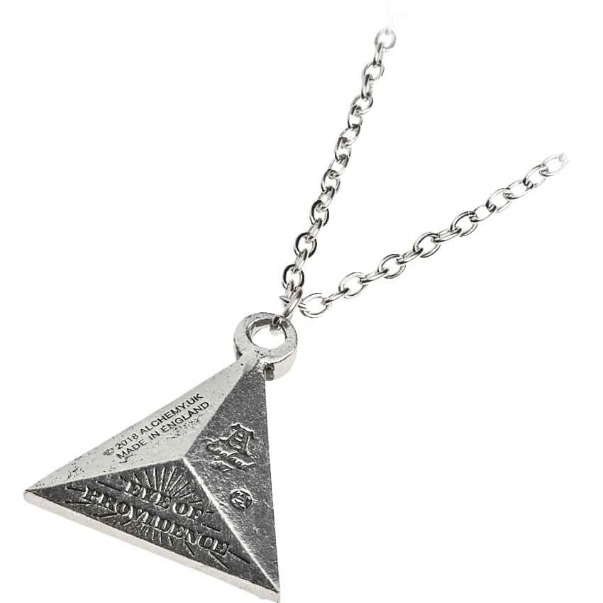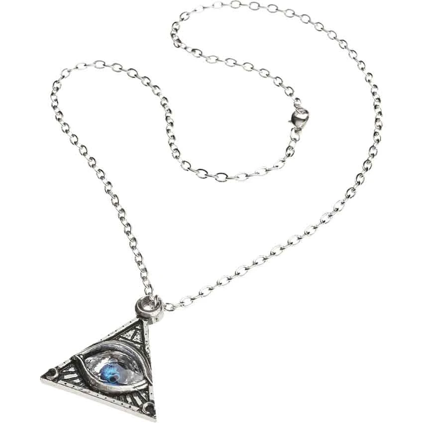 For over two centuries, the Freemasons have flourished. Could it be that their fortune has come from a divine overseer? The Eye of Providence Necklace takes the classic symbol of the Freemasons and allows you to add it to your ensemble. This pewter necklace depicts the iconic Freemason pyramid, its metallic form interrupted by the bright blue pupil of the all-seeing eye, constructed entirely of beautiful Swarovski crystals. The charm hangs from a lovely trace chain that fastens in the back via a lobster clasp, making wearing and removal easy. The Eye of Providence Necklace makes a fantastic gothic accessory that is sure to bring a bit of mystique to your outfit.