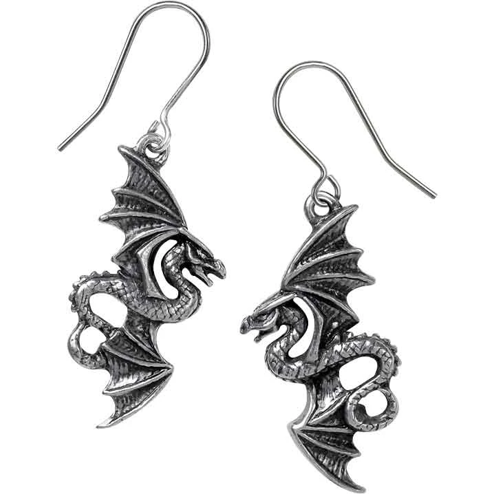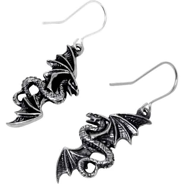 When you are looking for some fantasy earrings with some draconic style, you should make sure to check out the Flight of Airus Hook Earrings. Made from pewter, these earrings come as a pair. Each earring features a dragon-like creature called an amphiptere. It has two wings open in flight and its tail behind it. The creature faces left with one wing above it and the other below it. The upper wing connects to a fishhook backing. Thus, these earrings require pierced ears. You can easily wear this piece of jewelry with the Flight of Airus Necklace (AG-P917). These earrings make a wonderful personal accessory. They also work well with any fantasy jewelry collection.